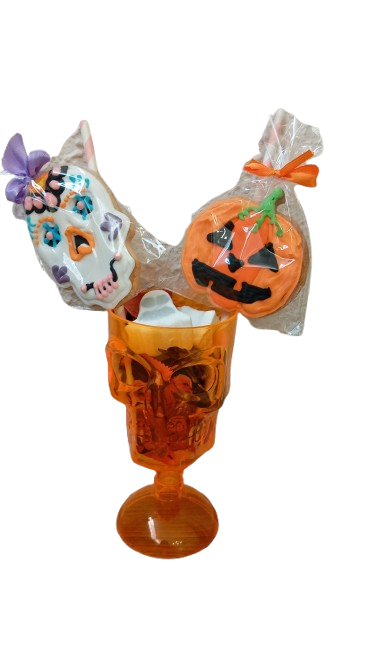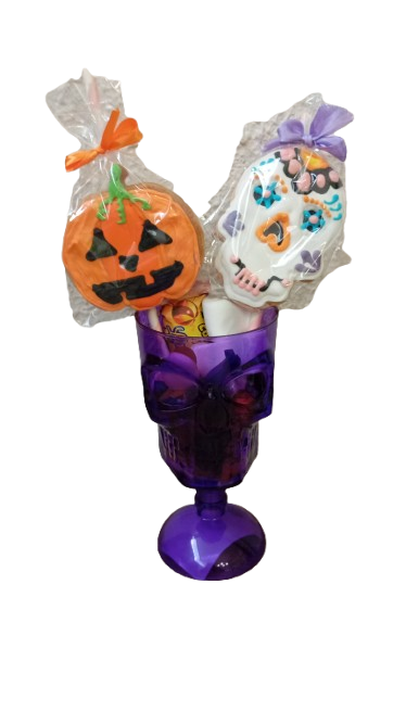 Copa personalitzada de Halloween ple de llaminadures i xocolatines i 2 galetes de mantega de Halloween decorades amb glassa. Dos copes disponibles: Taronja i lila. Galetes disponibles a triar (2 per copa): Carbassa, Barret de bruixa, catrina.